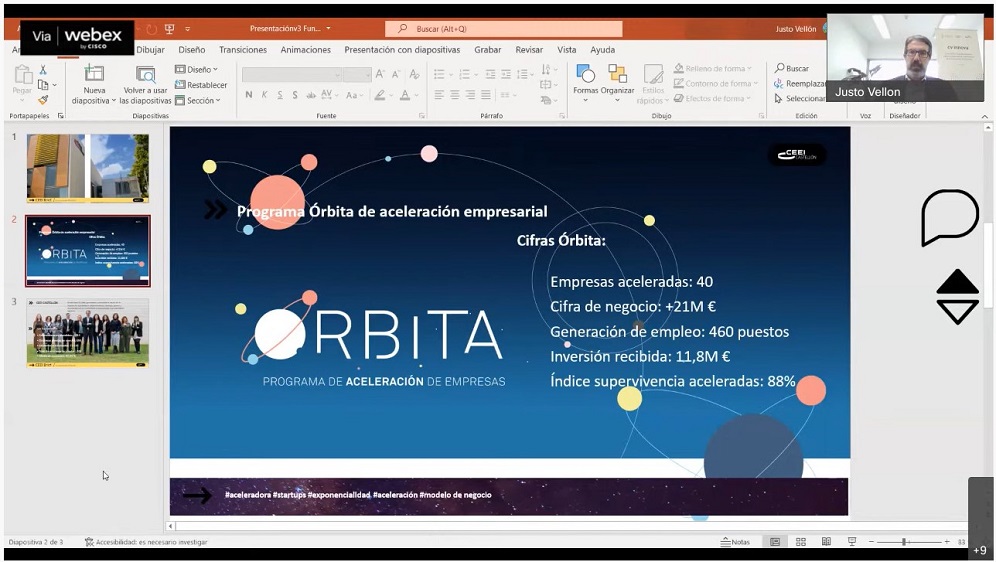 En su intervención en el encuentro virtual de Funcas, que ha sido presentado por el director general de Funcas, Carlos Ocaña, el director de CEEI Castellón, Justo Vellón, ha recordado que hace año y medio Órbita ya entró en el podio de las aceleradoras en la edición 2020-2021 del informe, por lo que este nuevo hito «supone para CEEI Castellón un honor que entendemos asimismo como una enorme responsabilidad, ahora que estamos en plena convocatoria de la quinta edición». Tras agradecer a la Diputación de Castellón su implicación en el proyecto, Vellón ha destacado que en los inicios del programa “queríamos demostrar y demostrarnos que estar lejos de las grandes ciudades no tenía por qué poner límites estrechos a los objetivos de un programa de aceleración”.